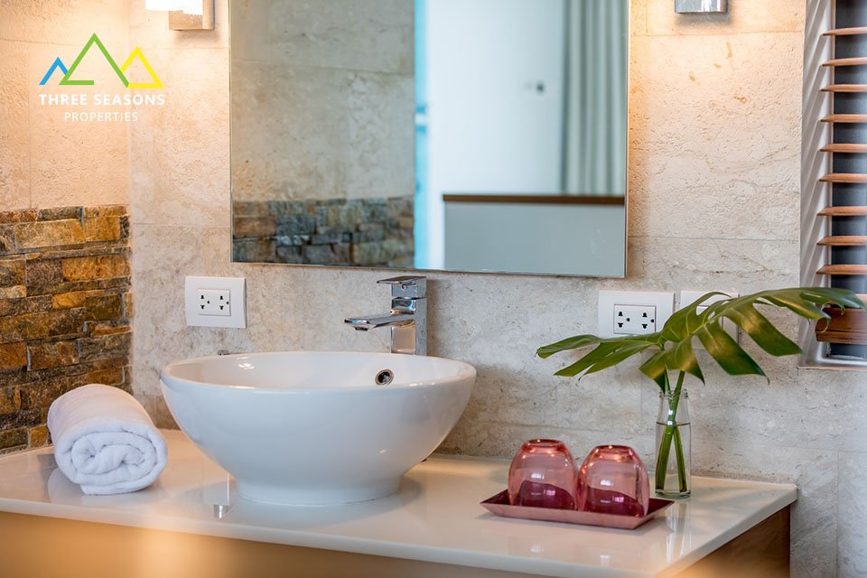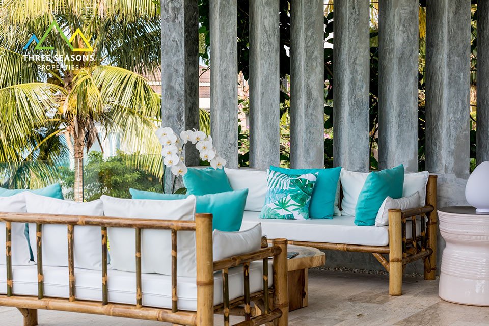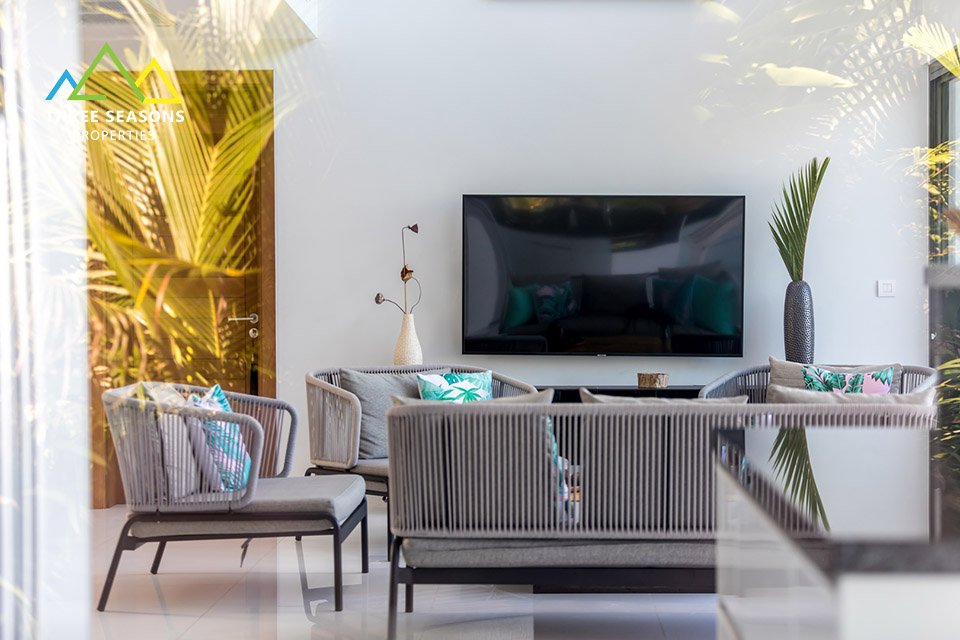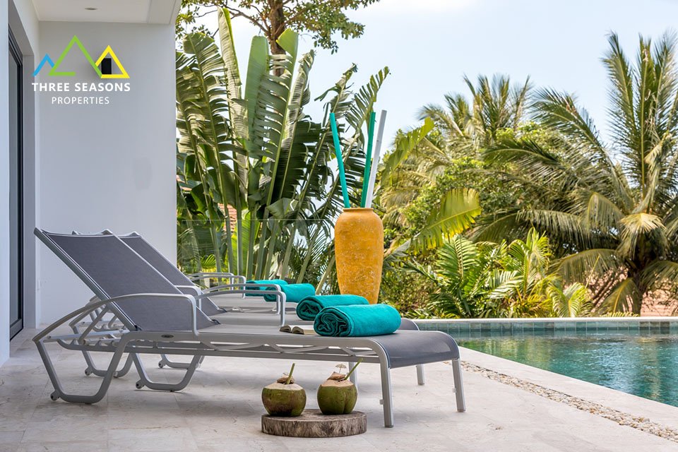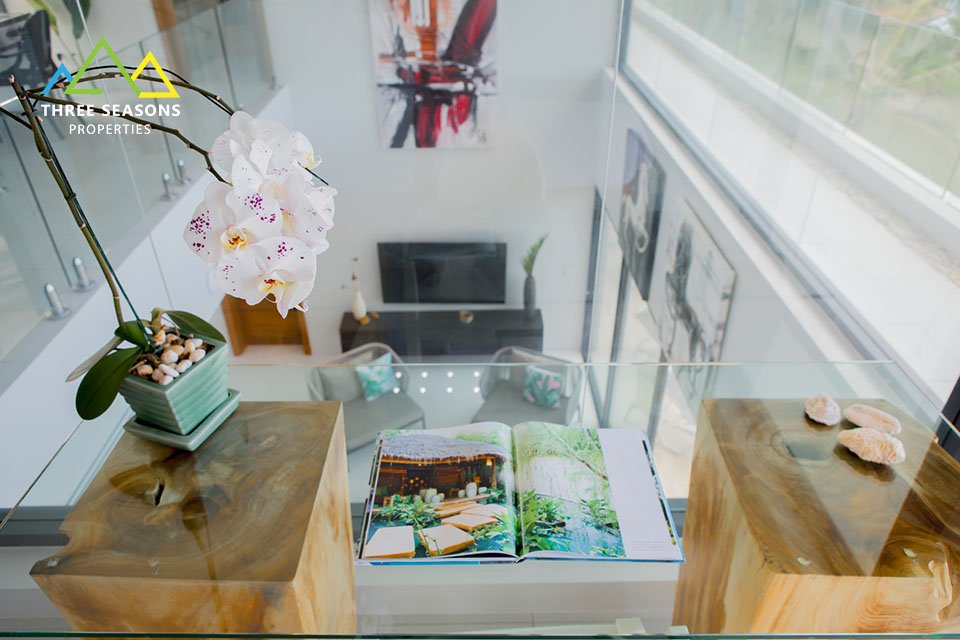 La villa tiene una superficie habitable total de 320 m² construidos en una parcela de 900 m², plantada con flores y árboles tropicales. La planta principal incluye un espacio de estar con una cocina abierta totalmente equipada, un dormitorio con baño privado, un trastero y un aseo. Este salón se abre a una gran terraza y una piscina infinita de 12×4 metros.