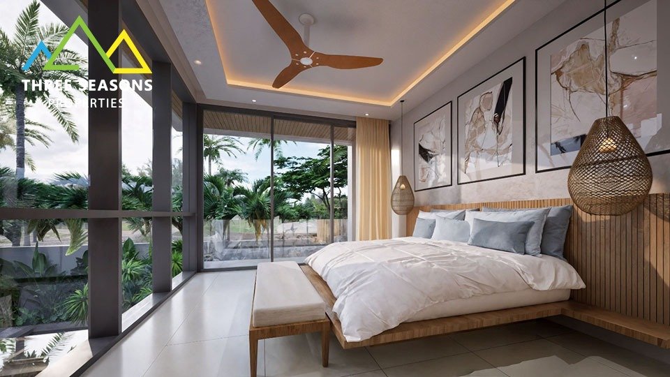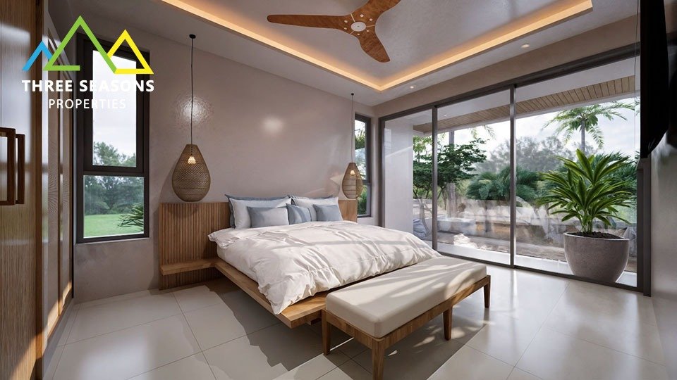 The master bedroom offers approximately 45 sqm of private space, featuring a built-in king-size bed, walk-in closet, and a tropical bathroom with outdoor bathtub. Direct access to the pool terrace reinforces the indoor-outdoor lifestyle.