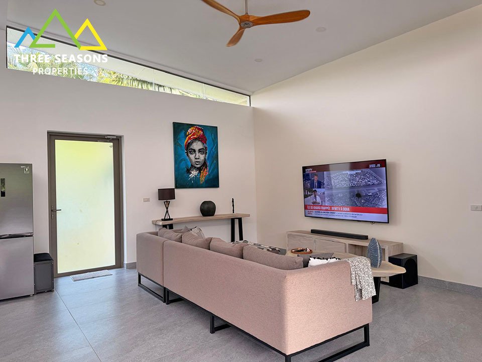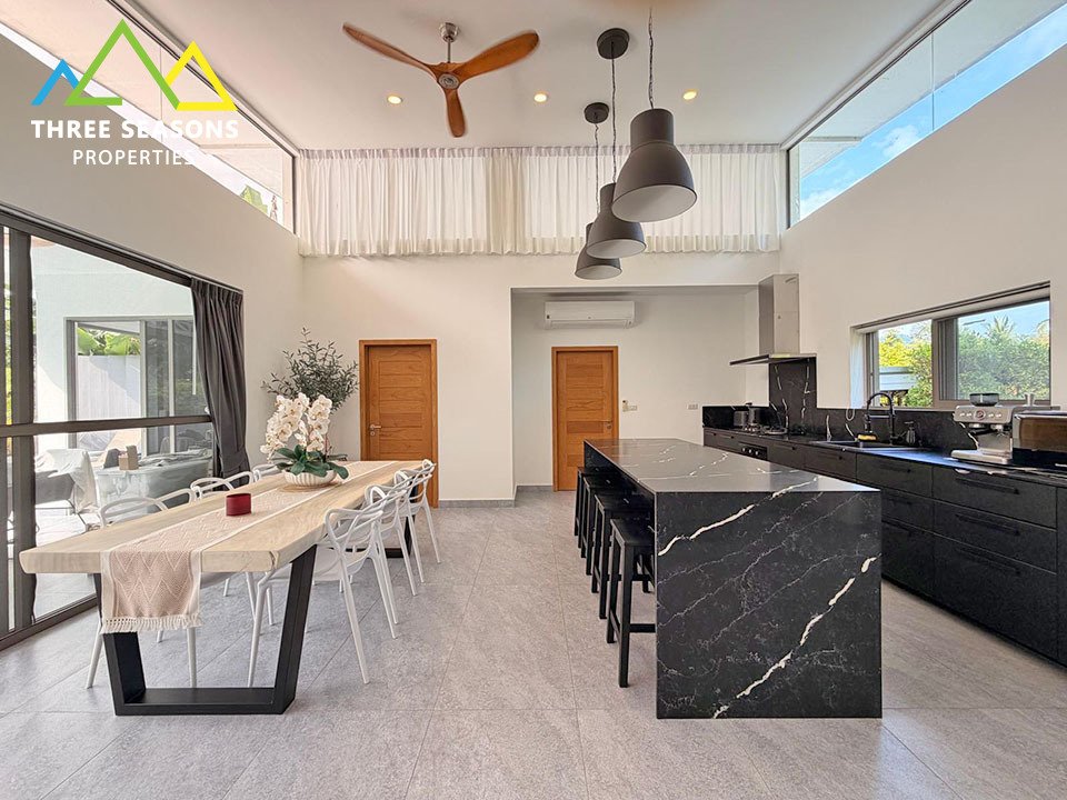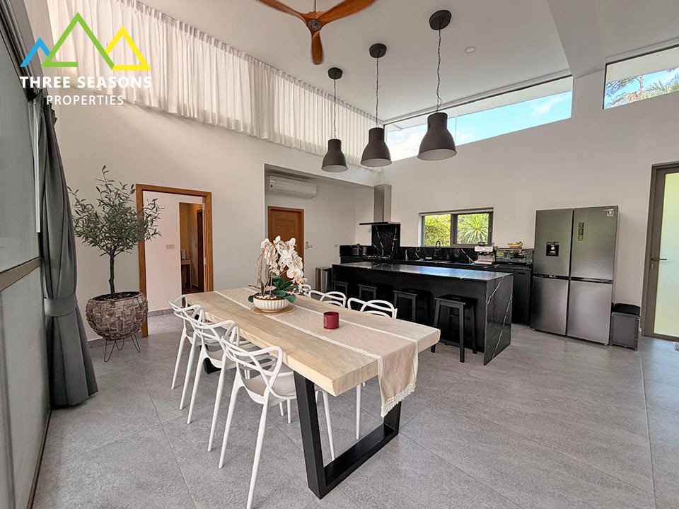 The villa features 3 comfortable bedrooms, designed for relaxed tropical living, along with a fully equipped modern kitchen and bright living spaces opening onto the outdoor area.