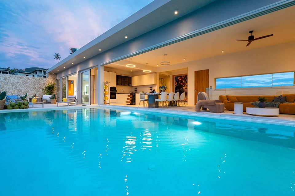 Modern luxury villa located on a hillside in the prestigious area of Chaweng Noi, offering stunning panoramic ocean views. The villa is only a short walk (about 3 minutes) to the beach and combines privacy, comfort, and high-end living.