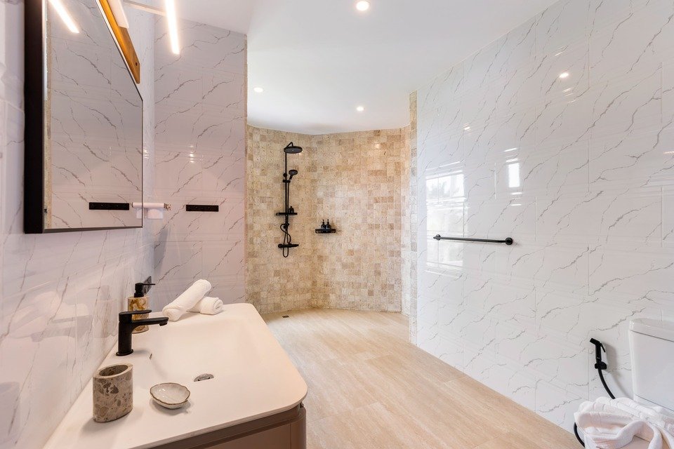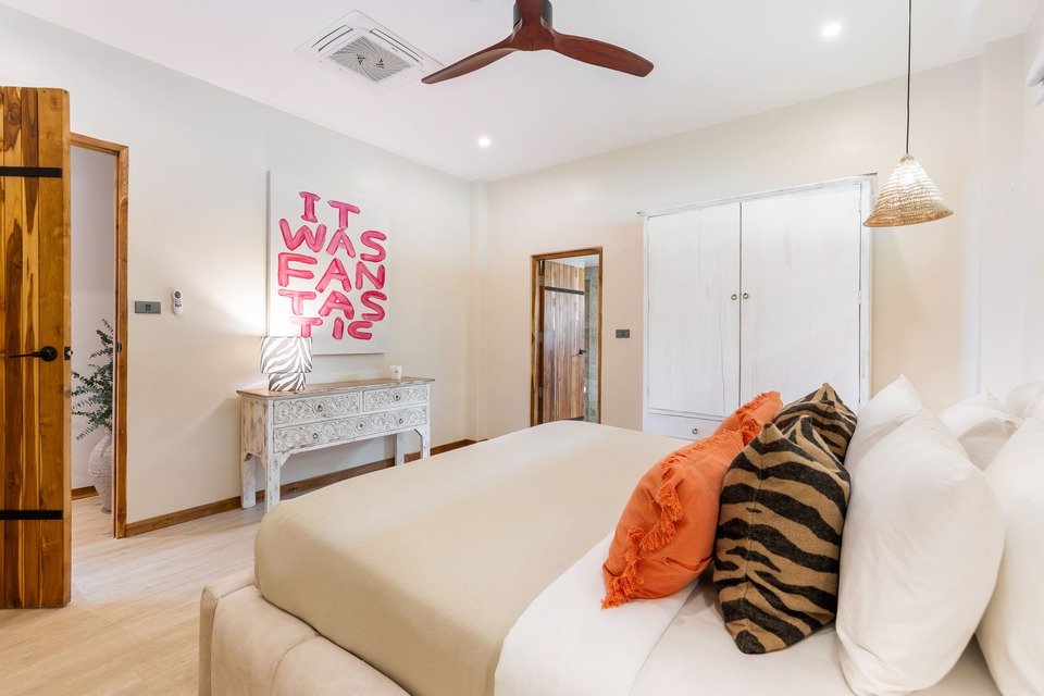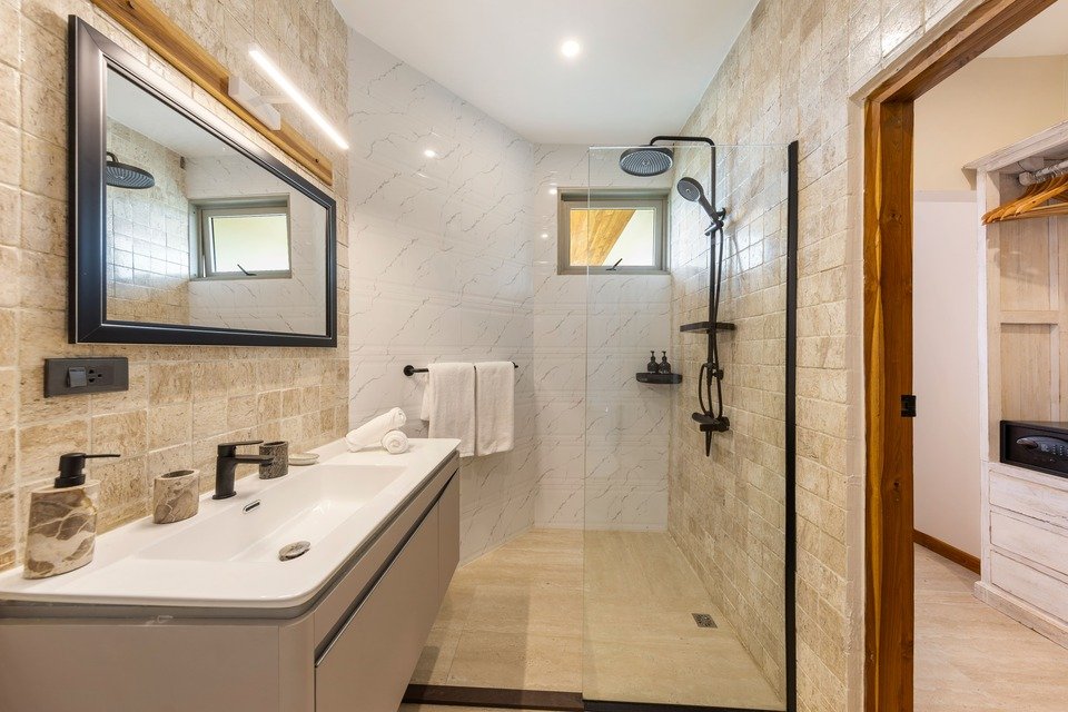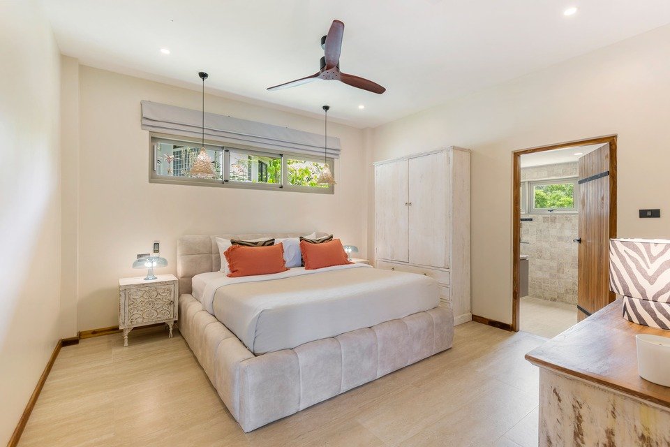 Each bedroom is a private sanctuary, featuring king-size beds, elegant en-suite bathrooms, air conditioning, and tasteful island-inspired décor. The villa’s expansive open-plan living area is designed for both relaxation and entertaining, with floor-to-ceiling windows framing breathtaking ocean views.
