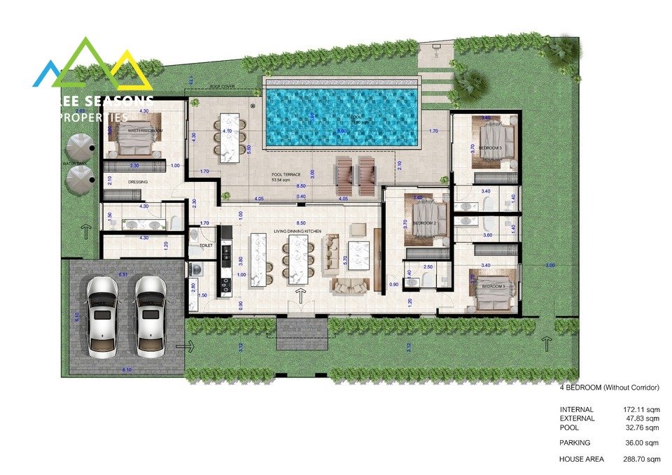 Available in 2, 3, or 4-bedroom layouts, each villa is built on unusually large plots for Lamai, allowing spacious outdoor areas, lush gardens, and a true sense of privacy. The architecture emphasizes open living spaces, natural light, and seamless indoor-outdoor flow, perfectly adapted to Koh Samui’s tropical lifestyle.