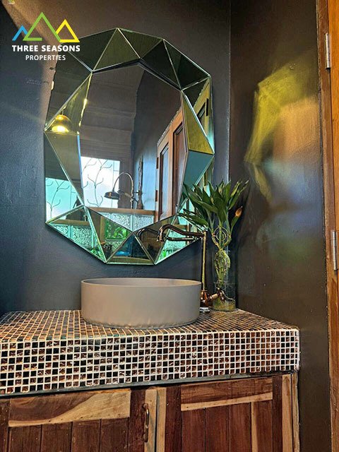 Upstairs, the villa offers a comfortable sleeping area composed of a main ensuite bedroom, a second bedroom, and an additional smaller ensuite bedroom. Natural light, teak wood finishes, and quality tiles give this level a warm and refined atmosphere.