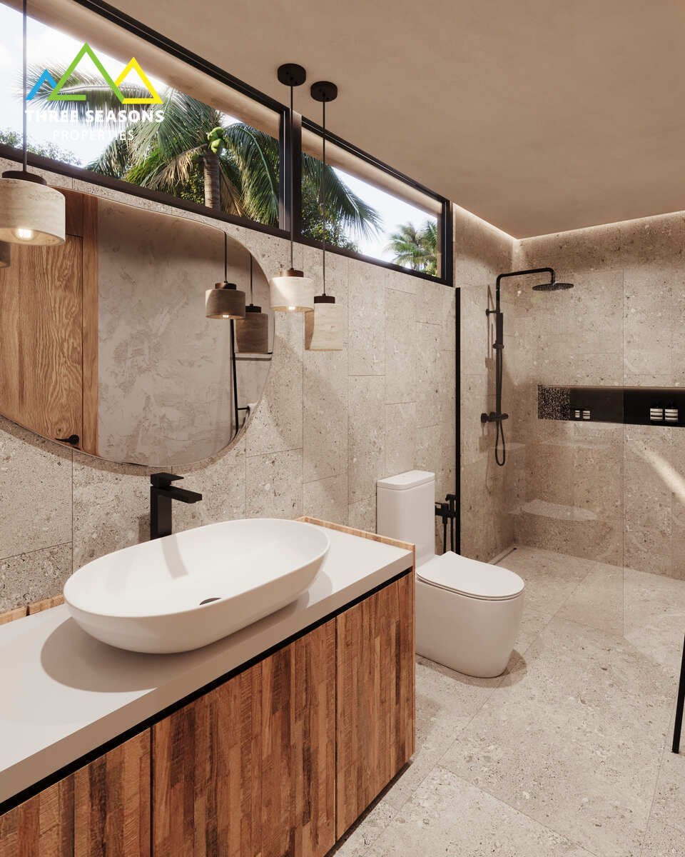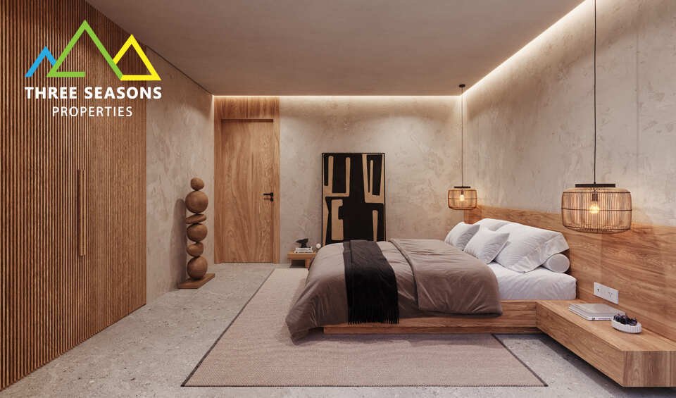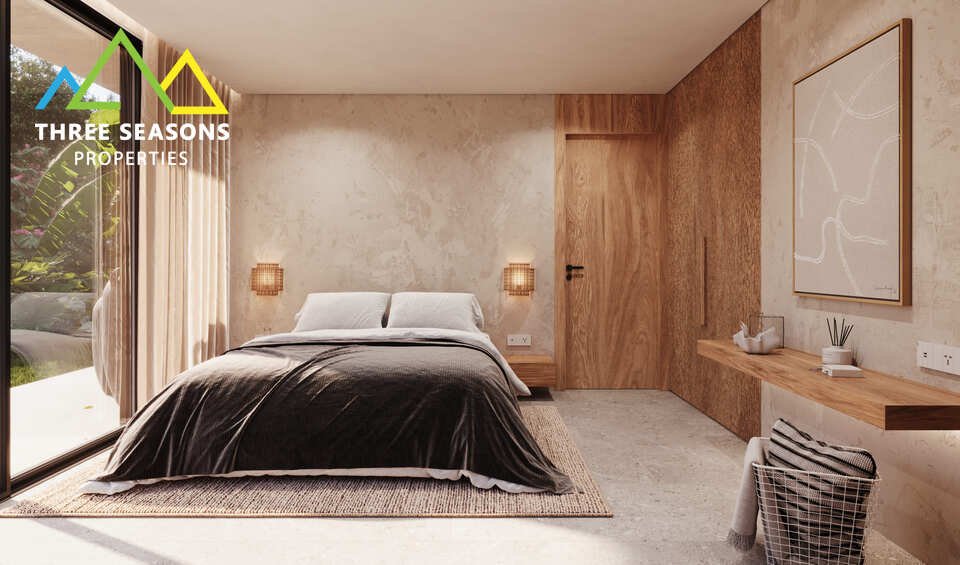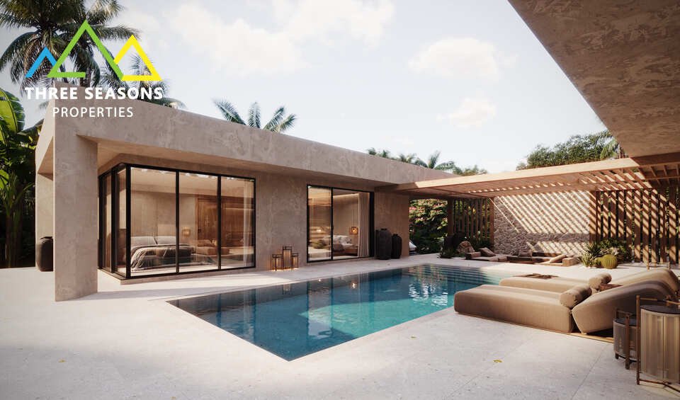 The villa features a single-level tropical layout, offering fluid circulation, ease of living, and a strong sense of privacy. Natural textures, soft neutral palettes, and expansive panoramic glazing define the interior, enhancing daylight, spatial openness, and material authenticity throughout the home.