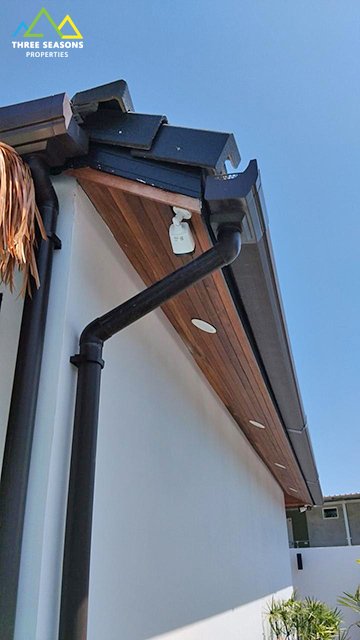 The property is laid out over one level and features 3 ensuite bedrooms, an open-plan living area with Western kitchen, and direct access to a private saltwater overflow pool framed by a teak deck and lush garden details.