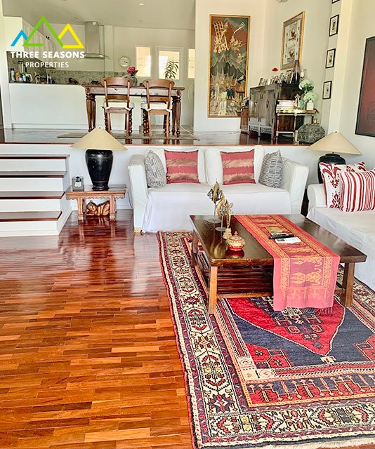 - Split-level living and dining area with teak flooring
