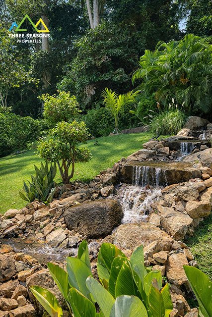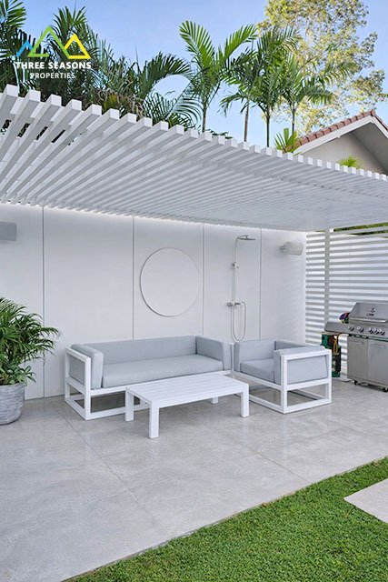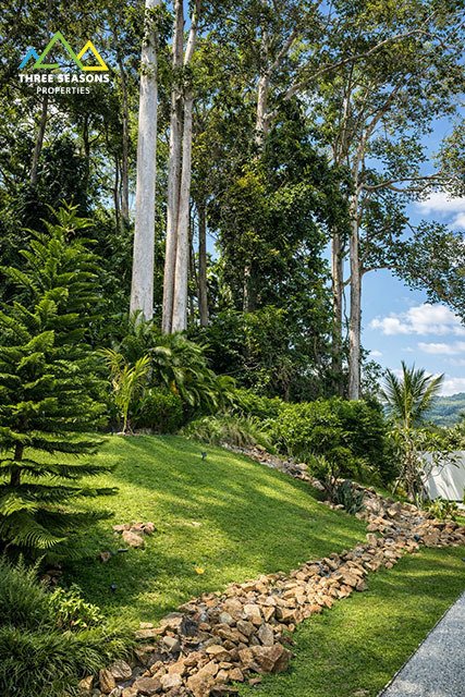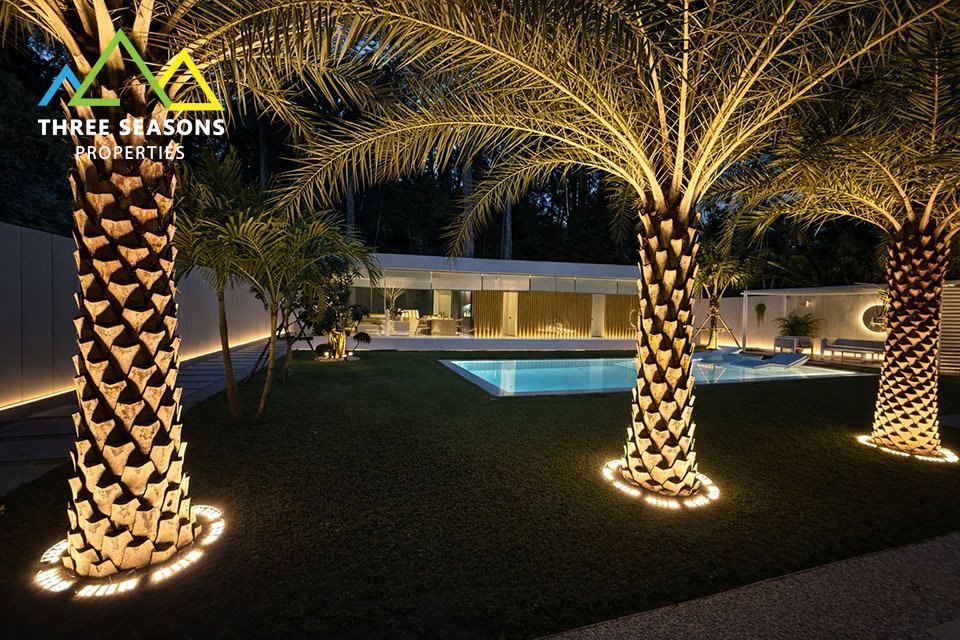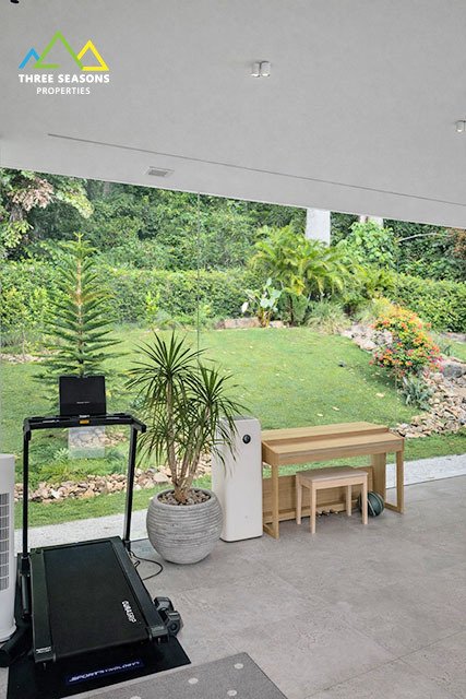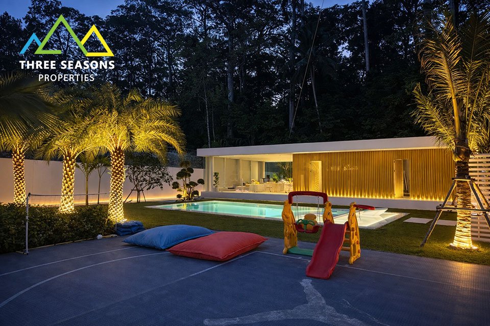 The property features approximately 250 sqm of interior living space on a generous 1,000 sqm land plot, providing plenty of space for outdoor living, relaxation, and entertainment. A long private swimming pool, landscaped garden, and outdoor lounge areas create the perfect environment for tropical living.