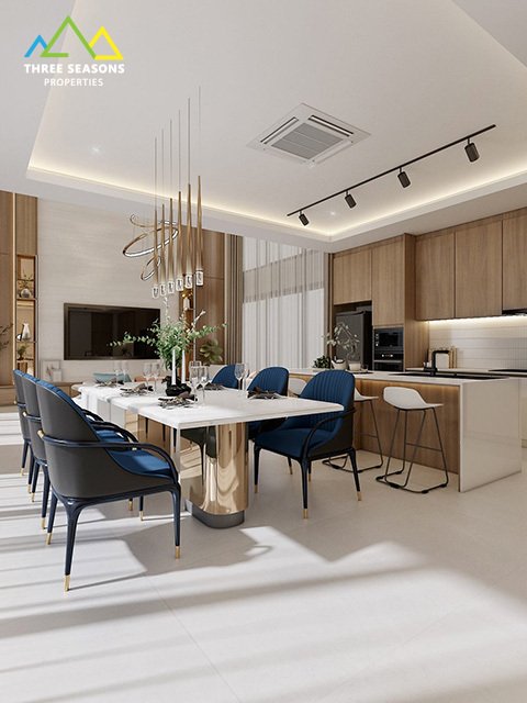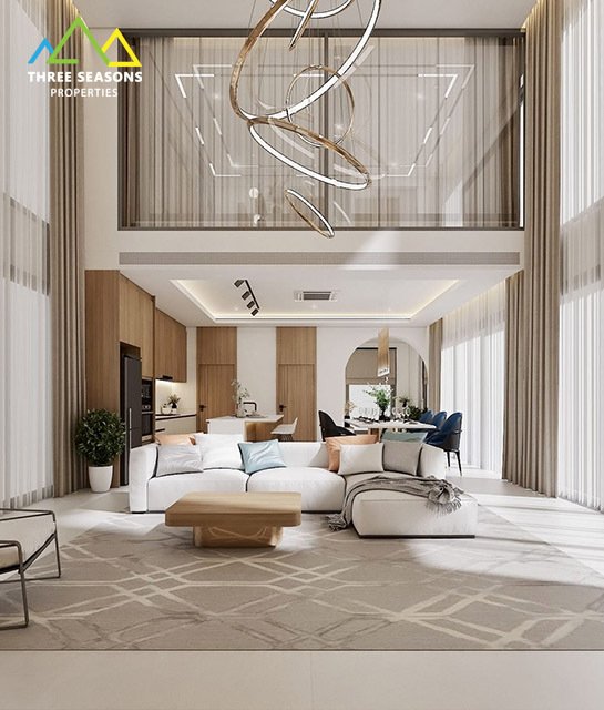 The villa features an open-plan living and dining area with floor-to-ceiling windows, allowing natural light to flow throughout the space while seamlessly connecting indoor and outdoor living. The fully equipped modern kitchen is designed with high-quality finishes, ideal for both everyday living and entertaining.