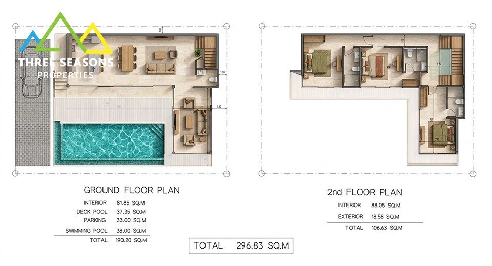 The property features 297 sqm of living space, designed with an open-plan concept that maximizes natural light and airflow. The ground floor offers a large L-shaped living and dining area with floor-to-ceiling glass sliding doors, seamlessly connecting to the expansive outdoor terrace and private swimming pool—ideal for relaxing or entertaining.