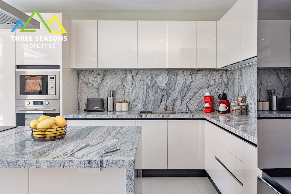 The modern kitchen is fully equipped with high-quality German appliances, including an induction hob, island extractor, integrated dishwasher, and elegant granite worktops.