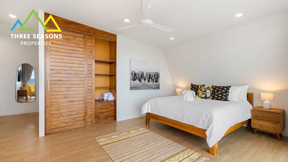 Take the stairs or your private elevator up to the expansive open-plan living area, where floor-to-ceiling windows frame breathtaking views of the bay. Slide open the doors to step onto the sun deck and dive into the infinity pool, soaking in the beauty of Koh Samui. Inside, unwind in the cozy TV lounge, enjoy your favorite playlists on the integrated sound system, or gather around the custom-built dining table that comfortably seats 10. The sleek, fully equipped western kitchen and guest toilet complete this floor, along with two spacious king-size en suite bedrooms, ideal for guests who prefer to stay on the middle level.